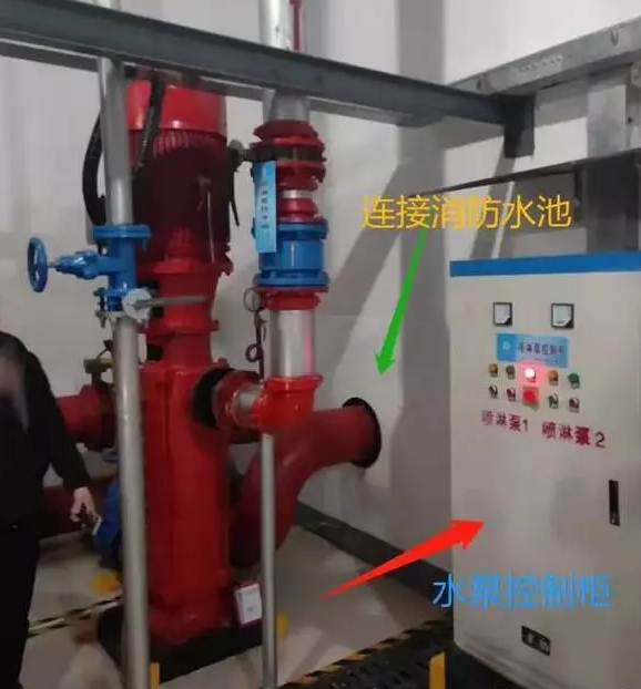 如下圖所示,消防控制柜和消防水泵同時安裝在消防泵房內。此時我們應該想到的是,在消防水泵控制室設置消防水泵控制柜時,其保護水平不應低于IP 30;與消防泵同一空間設置時,保護水平不得低于IP 55。此外,消防泵控制柜應采取措施,防止水淹。